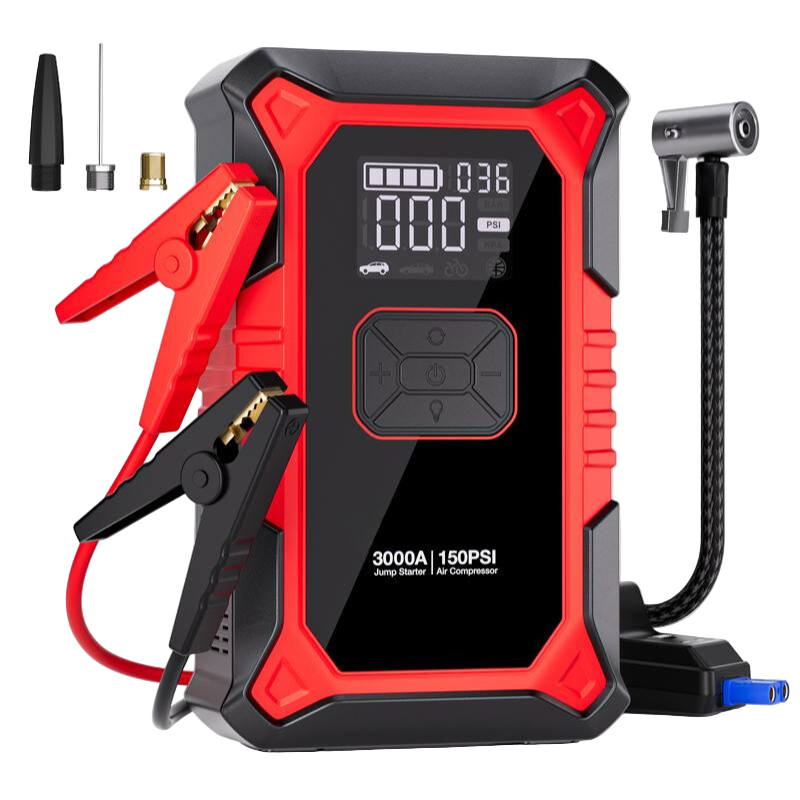 🔋 3000A Power: Instantly jump-starts 12V vehicles (up to 6.0L gas/4.0L diesel) with a "BOOST" button for low-voltage starts.